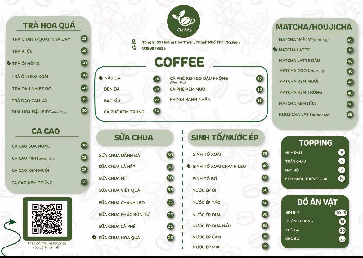 Menu tại Lối Nhỏ Coffee khá đa dạng nhưng dễ chọn. Mức giá dao động từ 20.000đ đến 45.000đ. Một vài món matcha có giá nhỉnh hơn, tuy nhiên vẫn phù hợp với sinh viên. So với không gian yên tĩnh và thời gian có thể ngồi lâu, mức giá này được xem là hợp lý.