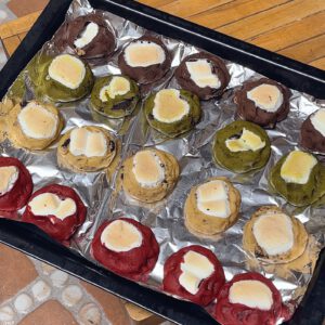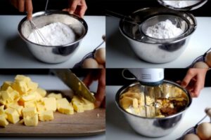 Nguyên liệu chính như bơ, bột mì, đường, socola hay matcha đều được chọn từ nhà cung cấp uy tín. Sau khi sơ chế, bột bánh được trộn theo công thức riêng, đảm bảo độ đồng nhất. Quá trình nướng được canh nhiệt chính xác để bánh chín đều, giữ được độ giòn bên ngoài và mềm bên trong.