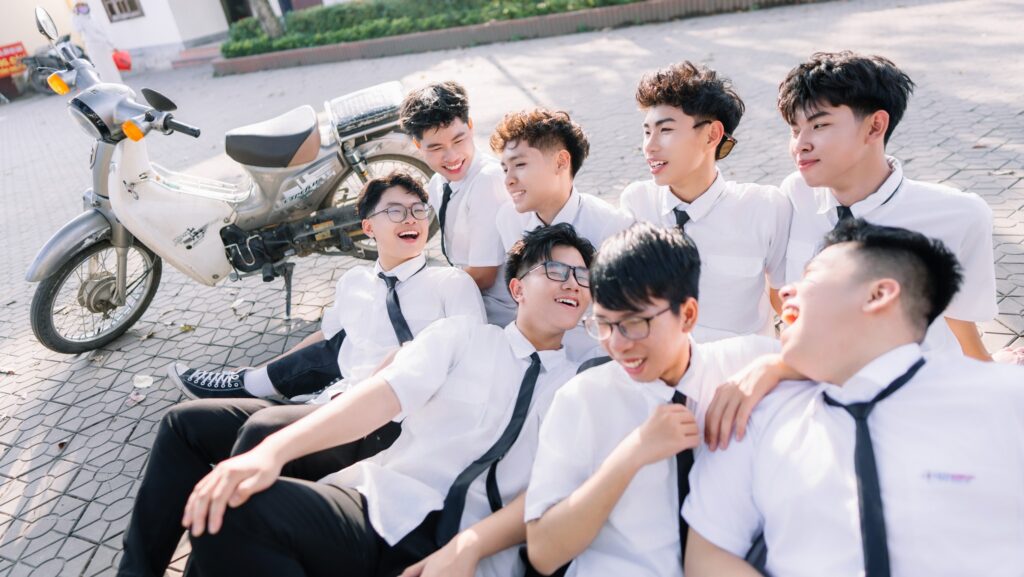 Đồng phục đơn giản, lớp học cũ → tạo cảm giác hoài niệm rõ rệt.