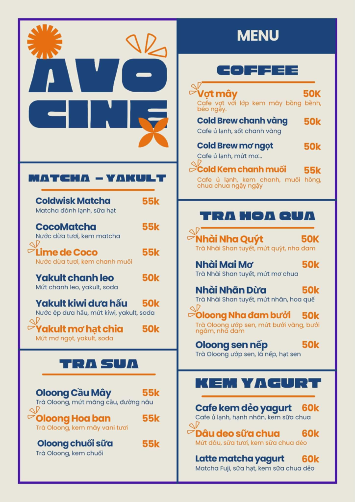 Một trong những yếu tố quan trọng tạo nên sức hút của mô hình cafe phim chính là menu đồ uống đa dạng, phù hợp với thị hiếu giới trẻ. Dù chưa có menu công khai chính thức, nhưng dựa trên mô hình cafe phim phổ biến, thực đơn tại Avocine được xây dựng theo hướng hiện đại, dễ uống và hợp “trend”.