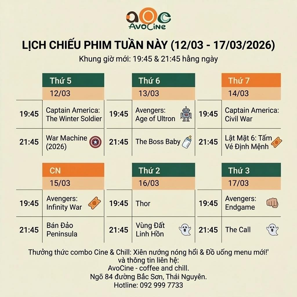 Tại Avocine, lịch chiếu thường được tổ chức theo hướng linh hoạt: