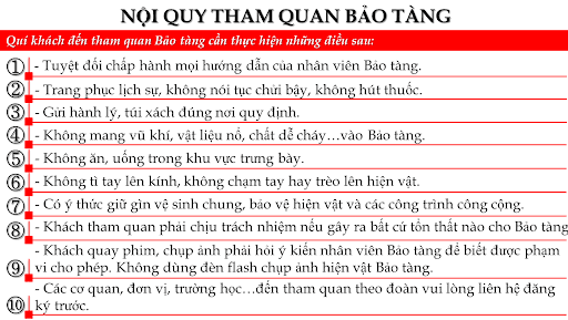 Trong quá trình tham quan, cần tuân thủ các quy định của bảo tàng như không chạm vào hiện vật, giữ gìn vệ sinh và không gây ồn ào. Điều này giúp bảo vệ các giá trị văn hóa lâu dài.