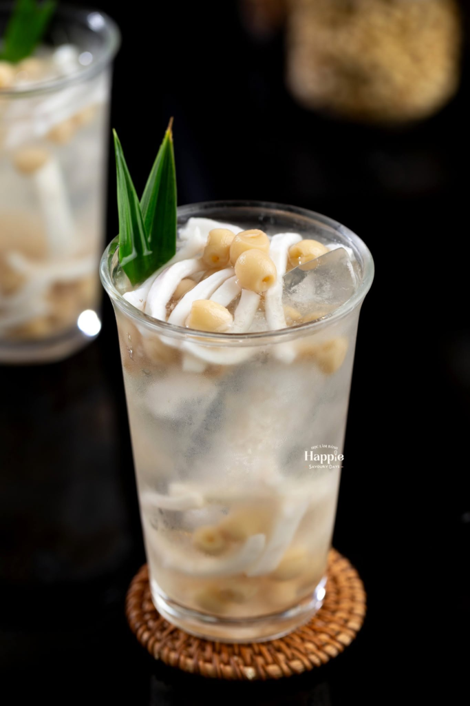 Điểm đặc trưng của món đồ uống ngon này nằm ở sự kết hợp giữa hạt sen và nước dừa tươi – hai nguyên liệu quen thuộc nhưng lại mang đến giá trị dinh dưỡng cao. Hạt sen được nấu mềm vừa phải, giữ được độ bùi và thơm tự nhiên, trong khi nước dừa tươi mang vị ngọt thanh mát, giúp cân bằng tổng thể hương vị. Khi hòa quyện lại, tất cả tạo nên một thức uống nhẹ nhàng, dễ uống và cực kỳ “dễ nghiện”.