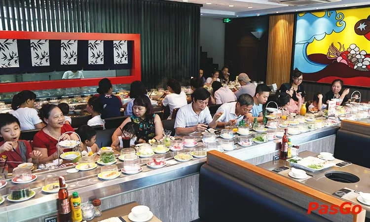 Điểm gây ấn tượng đầu tiên chính là hệ thống băng chuyền chạy quanh bàn ăn, nơi các đĩa đồ nhúng được sắp xếp gọn gàng và liên tục di chuyển. Thực khách không cần gọi món nhiều lần mà có thể chủ động lựa chọn theo sở thích, giúp việc thưởng thức lẩu ngon trở nên nhanh chóng và thoải mái hơn bao giờ hết.