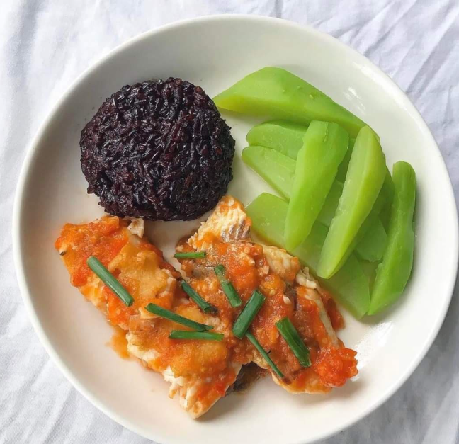 Thứ 6Cá hấp + cơm gạo lứt + rau xanh~420 kcal28g